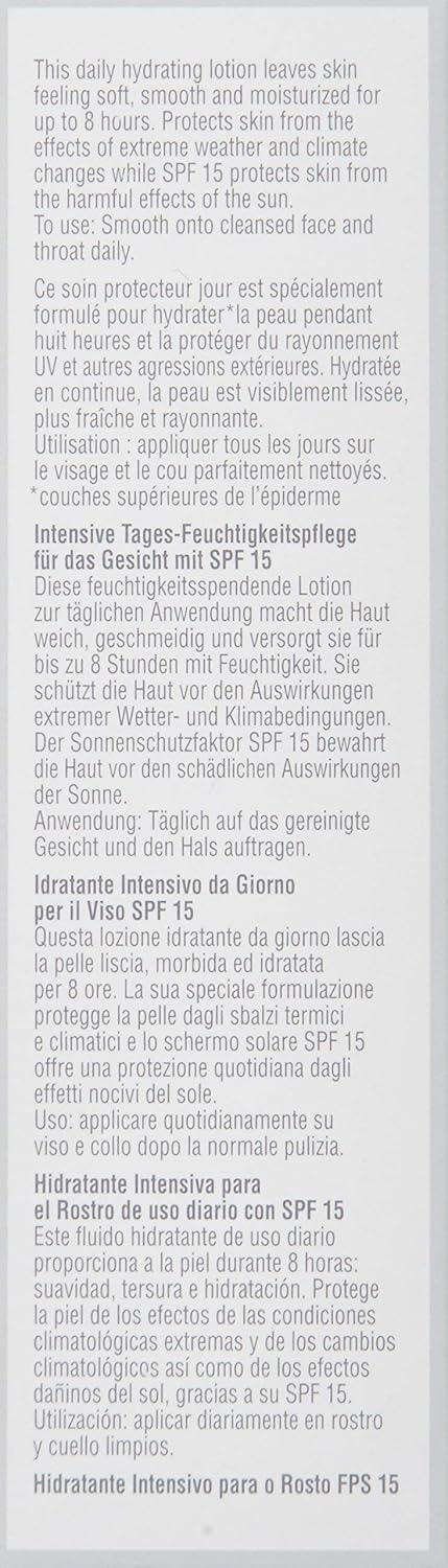 This moisturising lotion for daily use makes the skin soft, supple and provides them for up to 8 hours with moisture. It protects the skin from the effects of extreme weather and climate conditions. The sun protection factor SPF 15 protects the skin from the harmful effects of the sun. Suitable for all skin types.