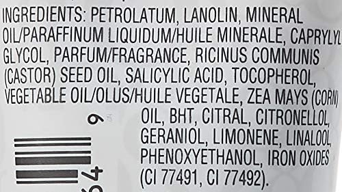 Petrolatum, Lanolin, Mineral Oil/Paraffinum, Liquidum/Huile Minerale, Caprylyl Glycol, Glycine Soja,(Soybean) Oil, Parfum/Fragrance, Ricinus Communis (Castor) Seed Oil, Salicylic Acid, Tocopherol, Zea Mays (Corn) Oil,Bht, Citral, Citronellol, Geraniol, Limonene, Linalool, Phenoxyethanol, Iron Oxides (Ci 77491, Ci 77492).