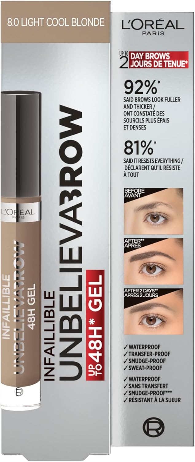 - Contents: 1x L'Oréal Paris Unbelievabrow Long Lasting Eyebrow Gel, Double-tip Attachment with included brush, Shade: Cool Blonde (102), 3.4 ml