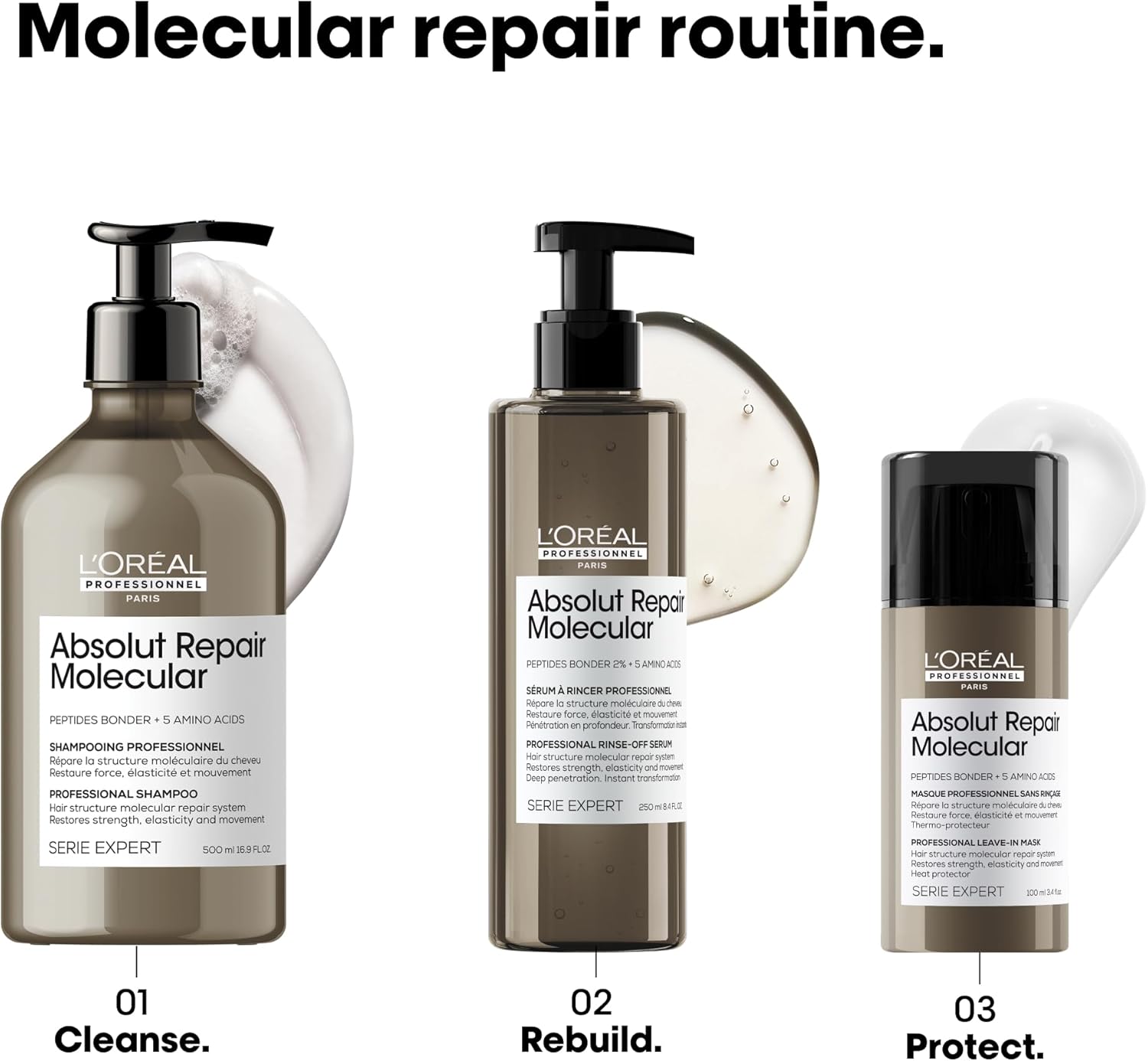 Thanks to its formula enriched with peptides, the Absolut Repair Molecular Hair Rinse-Off Serum repairs hair damage by injecting the essential components directly into the fibre in order to rebuild the molecular structure.